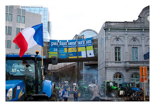 Het Luxemburgplein toonde nog de restanten van de strijd van gisteren, toen de boeren aankwamen en ze onmiddellijk wilden doorstoten tot in de Europese gebouwen. Dat lukte niet ondanks de 15.000 l melk die uitgespoten werd over de politie! Vandaag bleef alles droog ...